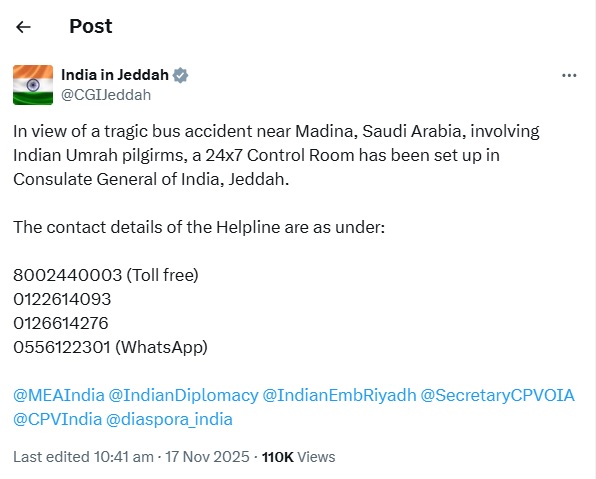 Nov 17, 2025 By News Desk विदेश सउदी अरब में सड़क हादसे में 42 भारतीय तीर्थ यात्रियों की मौत, हेल्पलाइन नंबर्स जारी पूरी खबर पढ़िए…सउदी अरब में सड़क हादसे में 42 भारतीय तीर्थ यात्रियों की मौत, हेल्पलाइन नंबर्स जारी