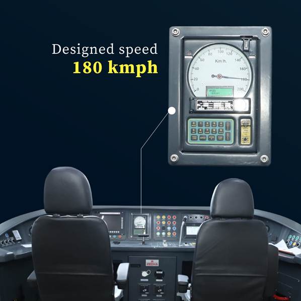 इसका एडवांस्ड एयरोडायनामिक डिज़ाइन हवा के प्रतिरोध को कम करता है, जिससे तेज़ गति पर भी स्थिर और आरामदायक यात्रा सुनिश्चित होती है। 180 किमी प्रति घंटे तक की गति से चलने में सक्षम, यह ट्रेन यात्रा के समय को काफी कम करती है और साथ ही शांत और प्रीमियम यात्रा का अनुभव देती है।