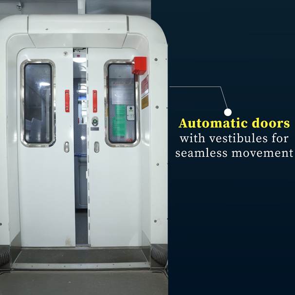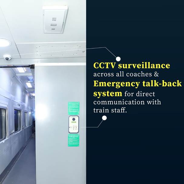 ट्रेन में ऑटोमैटिक दरवाज़े, बेहतर अग्नि सुरक्षा सिस्टम, कीटाणुनाशक टेक्नोलॉजी और सभी कोच में CCTV सर्विलांस जैसी सुविधाएं भी हैं। एडवांस्ड इमरजेंसी टॉक-बैक सिस्टम यात्रियों को आपातकाल की स्थिति में क्रू से सीधे बात करने में सहायता करता है। इससे तुरंत सहायता मिल सकेगी। ये सभी सिस्टम रेल सुरक्षा में नए बेंचमार्क स्थापित करते हैं, जिससे यात्रियों को पूरी तरह से मन की शांति मिलती है।